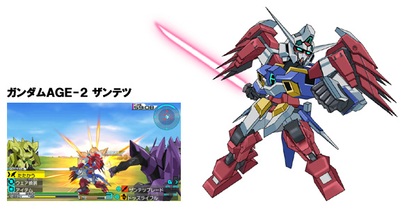 本作以RPG的方式進行「機動戰士鋼彈AGE」的世界冒險,完全收錄 「菲利特」、「阿瑟姆」、「奇歐」的3世代物語!在故事以及區塊間移動,和各式各樣的角色進行對話,有時候和敵人展開戰鬥, 跨越100年間的戰鬥將能夠藉由遊戲來真實體會。