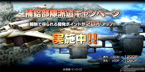 活動期間戰鬥報酬所獲得的開發點數增量20%。有效地累積點數,開發各式各樣的機動戰士及武器吧。