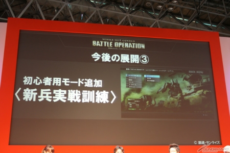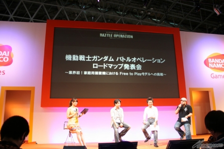 9 月20日(四)到23日(日)期間內舉辦,國內最大規模的電玩祭典「東京電玩展2012」。活動第2天,9月21日(五),NAMCO BANDAI GAMES攤位上實施現正好評發布中的PS3用遊戲「機動戰士鋼彈 戰鬥行動」的舞台活動『「機動戰士鋼彈 戰鬥行動」夢想藍圖發表會 ~業界首次!家庭用主機Free to Play模擬挑戰』。