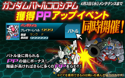3月27日(三)起至4月3日(三)止,期間限定內將舉辦「鋼彈戰鬥競技場」以及「獲得PP上升活動」。