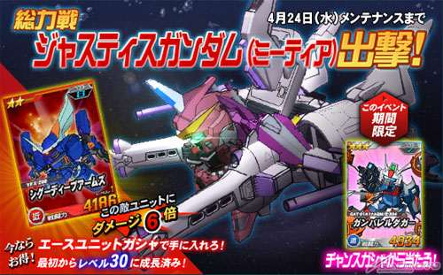 今天4月10日(三)12:00起到4月24日(三)為止的限定期間內,「正義鋼彈(流星裝備)」將會在總力戰中登場。在期間中執行任務時,有機會遇上「正義鋼彈(流星裝備)」。