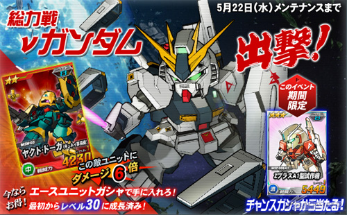今天5月8日(三)12:00開始到5月22日(三)為止的限定期間內,總力戰中「ν鋼彈」登場。期間中進行任務有機會遭遇到「ν鋼彈」。