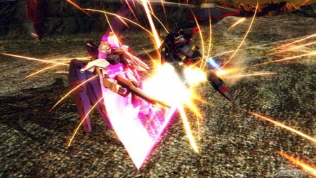 ▲主射擊武裝集氣後,會變成「光束突擊砲【速射】」,跳起來變成MA型態使用光束突擊砲進行3連射。