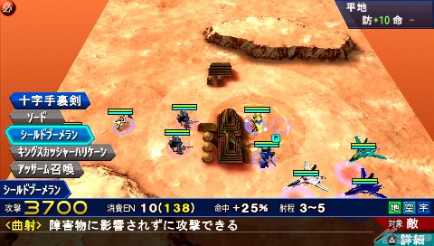 在MAP上和敵方之間有障礙物存在的狀況下,無法對敵人進行通常攻擊,但若是有具備「曲射攻擊」武器的機體,就能夠越過障礙物進行攻擊。