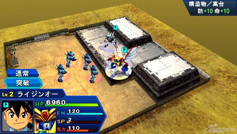 機體選擇「突破攻擊」後,決定射程範圍內的移動位置,接著就會顯示移動範圍内每台針對每台敵機的命中率,可以攻擊所有顯示出來的機體。