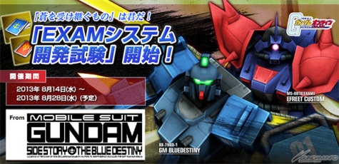 NAMCO BANDAI ONLINE好評提供服務中的Windows專用網路遊戲「機動戰士鋼彈ONLINE」將在8月14日(三)的定期維修結束時,舉辦大型更新「Act.2」實裝後,第一個遊戲內活動「EXAM系統開發測試」。