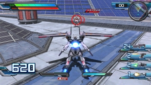 畫面左下方是自機的耐久值和對我方友機所下的指示,中央下方是EX量表和爆發類型、推進器量表。畫面右下方是武器和子彈數量。