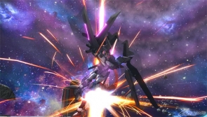 ▲爆發攻擊是「一齊射擊」。使用兩肩的MEGA粒子砲長時間照射,背後裝備的飛彈發射期器同時發射許多的飛彈。