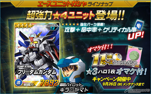 王牌機體轉蛋同樣從今天起追加「★4 自由鋼彈」以及「★3達基‧伊爾斯(白)」等強力機體。