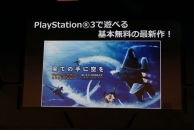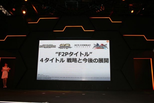 這一天攤位内的舞台活動,是由好評提供中的PS3專用網路戰鬥動作遊戲「機動戰士鋼彈 激戰任務」和「鐵拳 Revolution」、「ACE COMBAT INFINITY」、「SOULCALIBUR Lost Swords」等作品的製作人,針對上述4款免基本費的F2P(=Free to Play)類型遊戲來做介紹並進行座談。