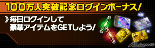 活動內容之一的「突破100萬人次!紀念登入獎勵!」是在10月1日(二)起到8日(二)止的期間中,每天登入遊戲1次就可以獲得自用行動EN回復包、自用指揮力回復包、黃金轉蛋票、黃金駕駛員轉蛋票、豪華轉蛋票、百萬轉蛋票等道具中的其中1種。