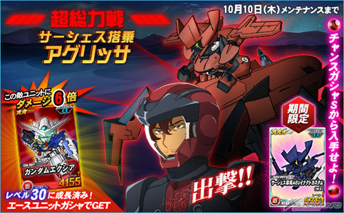 NAMCO BANDAI ONLINE在「Yahoo!遊戲」上提供中的免基本費網頁遊戲「SD GUNDAM OPERATIONS」從今天10月3日(四)起,「沙瑟斯搭乘的亞格利沙」在超總力戰中登場。