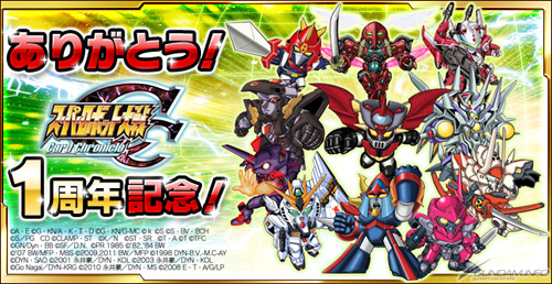 NAMCO BANDAI GAMES在Mobage上好評提供中的社群卡片遊戲「超級機器人大戰 Card Chronicle」,為了紀念從9月13日開始提供服務到現在屆滿1周年,從今天10月15日(二)起開始「1周年慶祝活動」。