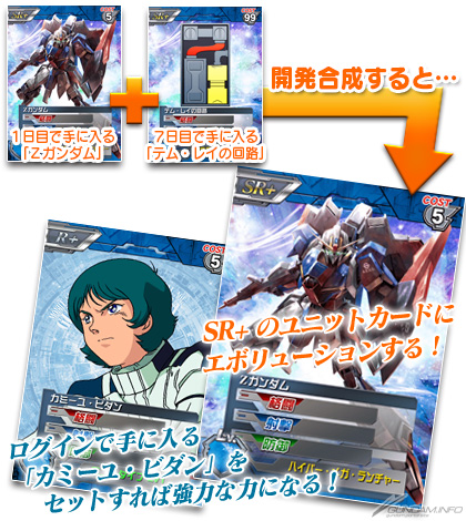 獎勵方面則有「R+ Ζ 鋼彈」、以及跟「R+ Ζ 鋼彈」進行開發合成就能獲得「SR+ Ζ 鋼彈」的「SR+ 提姆・雷的回路」等豪華禮品。