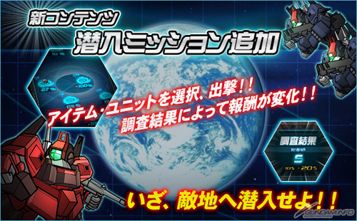 今天10月24日(四)起新內容「潛入任務」上線了。「潛入任務」是將自己體手上的機體編成潛入部隊,派遣他們到任意的敵方據點進行調查,以獲得經驗值和報酬的內容。