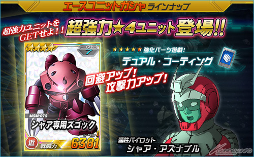 而除了「破滅鋼彈(MS)」在總力戰中登場以外,王牌機體轉蛋中還新追加了超強力機體「★4 夏亞專用茲卡克」。