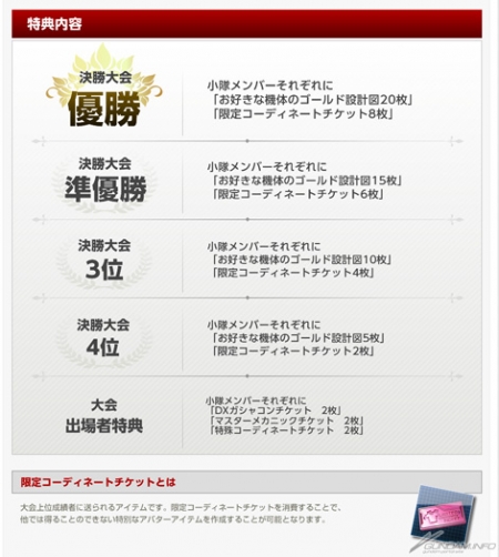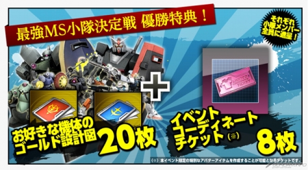漂亮獲勝的小隊,每一名小隊員都可以獲得各自「想要的金色機體設計圖×20張」、活動限定道具「限定調整票×8張」。