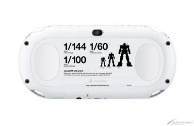 內附的新型PlayStation Vita主機以「白色」為主機的底色,再加上本作象徵本作中挑戰巨大鋼彈的『鋼彈模型比例感』設計。而同樣包含在商品中的原創配色鋼彈模型,一如本遊戲的遊戲性,「HGUC 薩克II」的機體配色和鋼彈同樣是三色配色樣式。