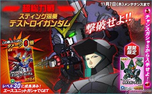 從今天10月31日(四)起到11月7日(四)止的限定期間內,「史汀格搭乘的破滅鋼彈」將在超總力戰中登場。期間中進行任務的時候,有機會遭遇「史汀格搭乘的破滅鋼彈」。