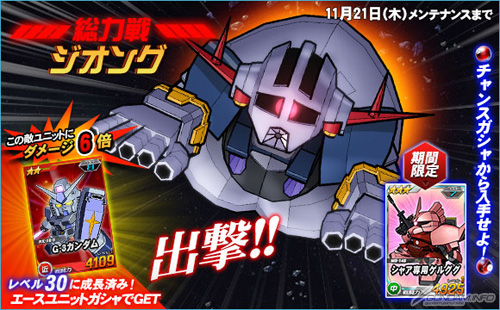 而在打倒「吉翁克」時就可抽的機會轉蛋中,不但有機會抽到「夏亞專用傑爾古格」,王牌機體轉蛋中還會追加可對「吉翁克」發揮6倍攻擊力的「G-3鋼彈」。