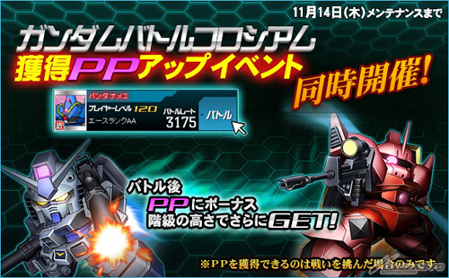 同樣從今天11月7日(四)起到11月14日(四)止的期間內,將舉行「鋼彈鬥技場」以及「獲得PP增加活動」。