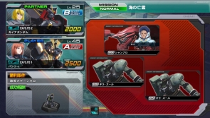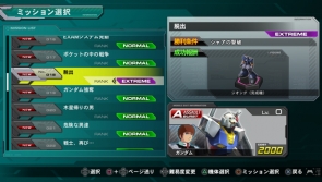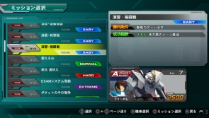 ▲任務可以選擇4種不同的難度,根據任務不同有不一樣的勝利條件。在機體選擇畫面中,從所有可以操縱的機體當中選出1台來挑戰任務,選擇後會表示目前選擇機體的等級和選擇的爆發攻擊類型。