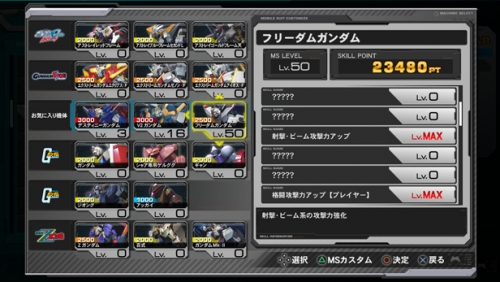 ▲在任務選擇畫面按下△鍵,就會跳到使用機體的選擇畫面。從全部機體當中選擇喜歡的MS。另外也有登錄「喜愛機體」的欄位,可以設定使用頻度較高的機體喔。