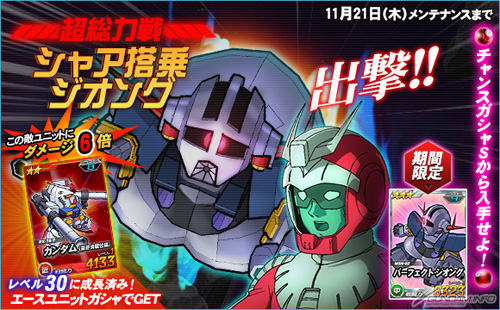 今天11月14日(四)開始到11月21日(四)為止的限定期間內,在超總力戰中「夏亞駕駛的吉翁克」將會登場。在期間中進行任務的時候,將有機會遭遇「夏亞駕駛的吉翁克」。