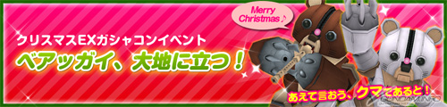 12 月11日(三)的定期維修結束後將舉辦的「聖誕節EX轉蛋活動」,可以在12月25日(三)為止的活動期間中使用租借機體「熊亞凱」並得到聖誕節造型的特別駕駛員服裝道具。