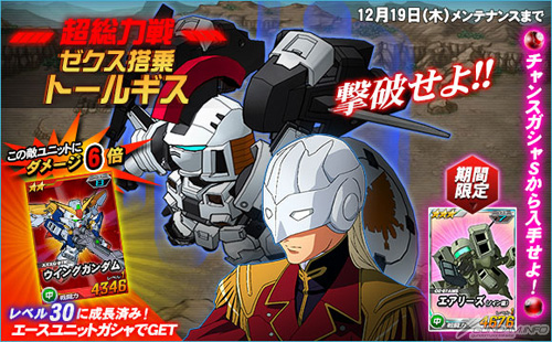 NAMCO BANDAI ONLINE在「Yahoo!遊戲」上提供中的免基本費網頁遊戲「SD GUNDAM OPERATIONS」,從今天12月12日(四)起「傑克斯駕駛的托爾吉斯」在超總力戰中登場。此外,王牌機體轉彈中追加了「★3 飛翼鋼彈」等3台機體,白金駕駛員轉蛋中新追加了「★3 傑克斯・馬吉斯」、「★3 張五飛」,並開始「機體強化費用減少活動」。