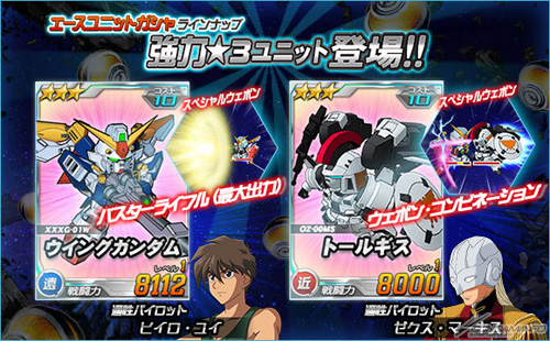 王牌機體轉蛋同樣從今天起追加了「★3 飛翼鋼彈」、「★3 托爾吉斯」、「★3 神龍鋼彈」。「★3飛翼鋼彈」以及「★3 托爾吉斯」是搭載了特殊武裝的超強力機體,請一定要想辦法拿到手。