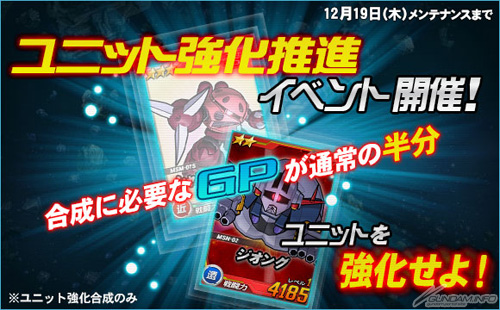 此外,減少在合成機體時所需「GP」量的「機體強化費用減少活動」也開始了。在活動期間中可以很有效率的合成機體,千萬不要錯過了。舉辦期間到12月19日(四)為止。