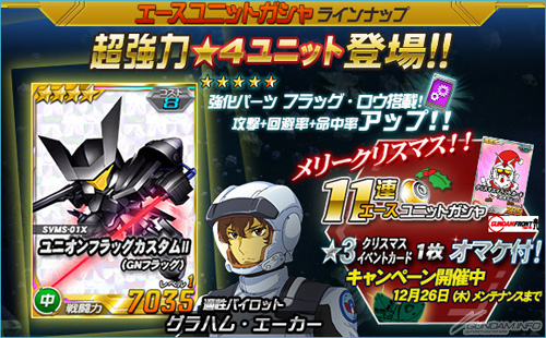 同樣於即日起到12月26日(四)的限定期間內,聖誕節特別活動同時開跑。凡是在活動中期間中達成指令,或是使用「總力戰」機會轉蛋及「11連王牌機體轉蛋」,即可獲得強力的聖誕節活動卡片作為合成素材使用。