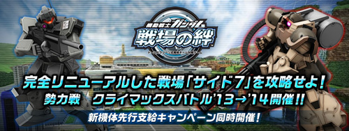 目前正好評營運中的大型機台電玩、圓頂式戰術小隊對戰遊戲「機動戰士鋼彈 戰場之絆」從今天12月24日(二)起將舉辦勢力戰「Climax Battle’13~’14」。