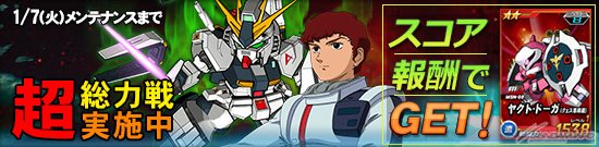 在這次的總力戰中登場的是「ν鋼彈」,而在超總力戰中登場的則是「阿姆羅駕駛的ν鋼彈」,從今天12月24日(二)起到1月7日(二)止的期間中進行任務時,有機會遭遇這些機體。