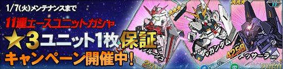此外在王牌機體轉蛋中,除了追加強力機體「★3 ν鋼彈」以外,過去在總力戰中出現的限期機會轉蛋也再次登場。而十分超值的「11連轉蛋 保證★3機體1台活動」也一併開始了。