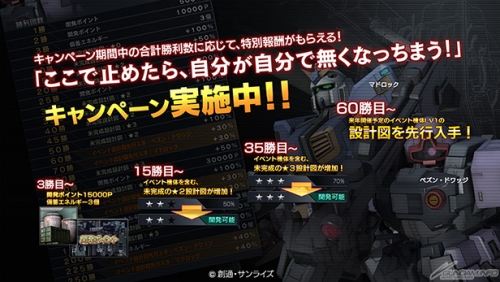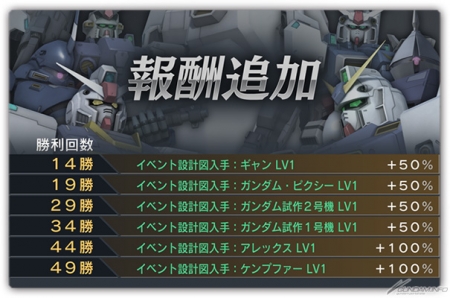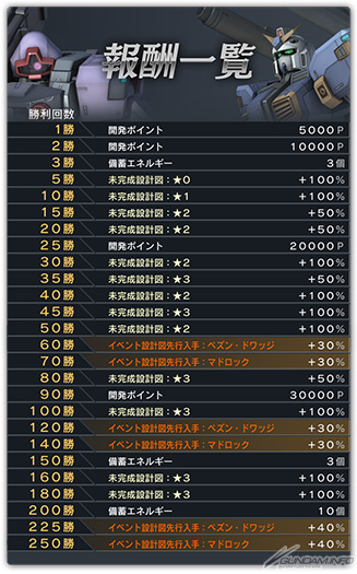 在報酬中有機會搶先獲得「泥岩(鋼彈6號機)」和「培森・德瓦金」等等活動機體的設計圖,快累積勝利來獲得這些豐富的報酬吧。
