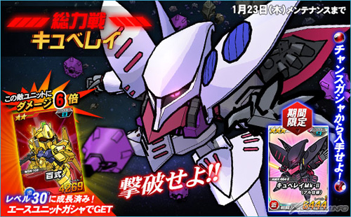 打倒「丘貝雷」的時候可以抽機會轉蛋,除了有機會獲得「★3丘貝雷Mk-II(普露機)」外,王牌機體轉蛋中追加了可以對「丘貝雷」發揮6倍攻擊力的「★2 百式」。