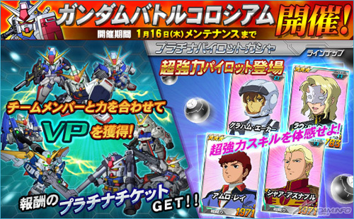 同樣於本日開始到1月16日(四)為止,限期舉辦「鋼彈鬥技場」以及「獲得PP增量活動」。「鋼彈鬥技場」是在活動限定期間內,藉由參加「鋼彈對戰」等方式來獲得「VP(Victory Points)」,並比較「VP」總量的競賽活動。