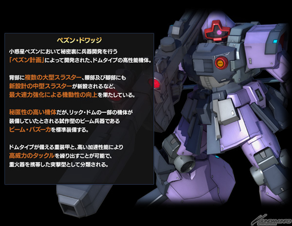 活動期間中,將有機會得到特別泛用機體「培森‧德瓦金 LV1」設計圖。這是台擁有高機動性,並且以強力的「光束火箭砲」為標準裝備的特別機體,務必參加活動來拿到手吧。