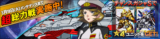 打倒「妲莉雅搭乘的智慧女神號」時可以抽的機會轉蛋S中,除了有機會獲得★4機體之外,王牌機體轉蛋中還追加可以對「妲莉雅搭乘的智慧女神號」發揮3倍攻擊力的「★2 蓋亞鋼彈(MS)」。