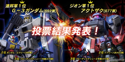 從超過4,000票的投票中脫穎而出的機體,地球聯邦軍是「G-3鋼彈」,吉翁公國軍則是「行動薩克」。這兩台的「LV5」機體過去只能透過購買商城的「錢包」進行開發,從本次活動起也可以利用遊戲内能免費獲得的「開發點數」進行開發了。