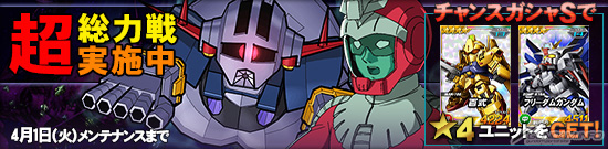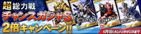 本項活動是超總力戰的「機會轉蛋S」,以及「機會轉蛋」可以抽的次數,在活動期間中會變成通常的2倍。舉辦期間到4月1日(二)為止。