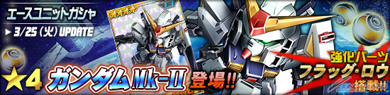 本日的更新中王牌機體轉蛋追加了「★4 鋼彈Mk-II」。鋼彈Mk-II是搭載了強化零件「FLAG・LOW」的強力機體,請務必要入手。