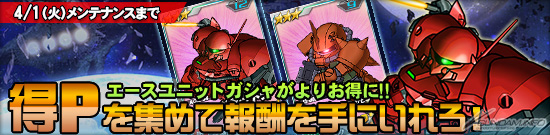 同樣於今天開始到4月1日(二)為止的「超值點數優惠活動」也開始了。本活動中,可以在抽「王牌機體轉蛋」或「11連王牌機體轉蛋」的時候,獲得點數(超值點數),而根據這些點數的合計值可以獲得各種報酬。累積超值點數來獲得「卡貝拉・迪特拉」和「薩克II(卡爾馬・薩比専用機)」吧。