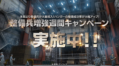 本活動到4月23日(三)為止的舉辦期間中,本部會投入大量的整備兵,全部的插槽強化機庫的整備成功率最多會增加30%。且由於整備成功率的增加多寡會根據機庫裡的機體等級來變動,請務必趁這個機會來多多整備自己喜歡的機體吧。