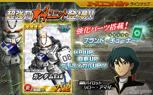 王牌機體轉蛋同樣從今天起追加「★4 鋼彈Ez8」、「★3 重武裝鋼彈」2台機體。「★4 鋼彈Ez8」是搭載強化零件「調節器」的強力機體,請一定要拿到手喔。