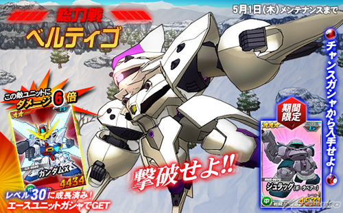打倒「貝爾堤哥」時可以抽機會轉蛋,除了有機會獲得「★3 修拉葛(波拉貝爾)」以外,在王牌機體轉蛋中,還追加可以對「貝爾堤哥」發揮6倍攻擊力的「★2 鋼彈X」。
