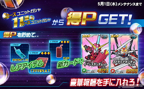 到5 月1日(四)止限期舉辦的「得P活動」,是根據抽「王牌機體轉蛋」和「11連王牌機體轉蛋」時所獲得的點數(得P)合計值,可以獲得各種報酬的活動。累積「得P」來換取「★3 神盾鋼彈(MS)」、「★3 攻擊鋼彈I.W.S.P」等豪華報酬吧。
