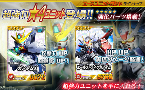 王牌機體轉蛋中,「★4 鋼彈X」、「★4 翔翼型攻擊鋼彈」、「★3 比基納‧基娜」全新登場。「★4 鋼彈X」、「★4 翔翼型攻擊鋼彈」等2台機體是搭載強化零件的強力機體。